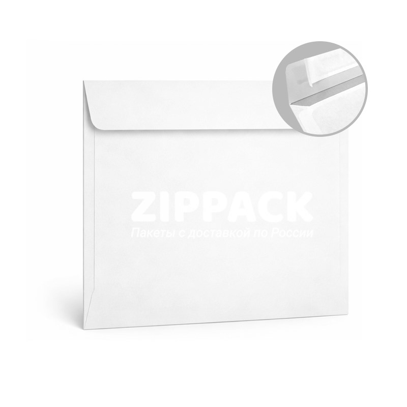 Квадратный белый конверт 200х200 мм. Изготовлен из белой офсетной бумаги увеличенной плотностью 100 гр/м2. Этот конверт имеет прямой самоклеящийся клапан с защитной отрывной лентой. Такая конструкция клапана обеспечивает более удобную и быструю заклейку корреспонденции.