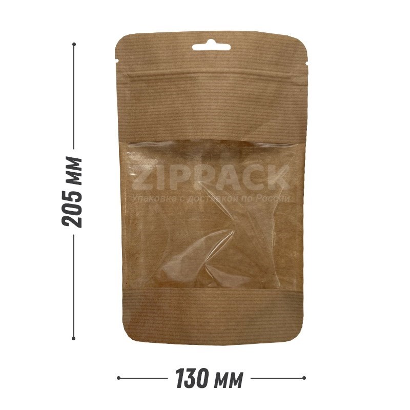 Крафт дой-пак 130×205 мм с окном, европодвесом и скруглёнными углами